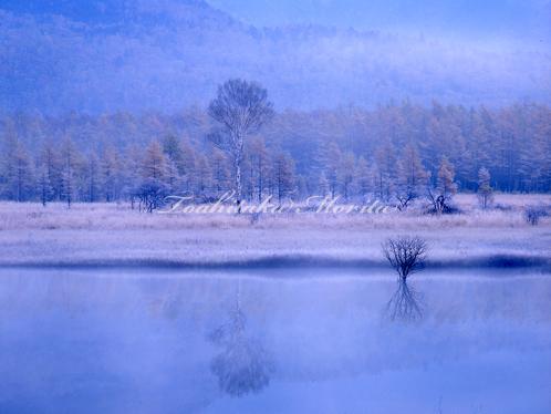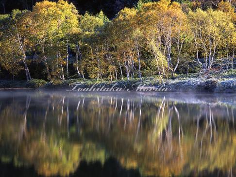 004963 黄葉の白樺林と霜の朝 志賀高原木戸池 長野県