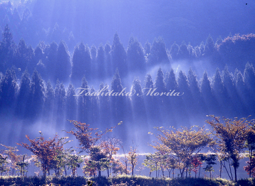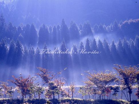 013008 朝靄と光芒の杉林 阿蘇 熊本県